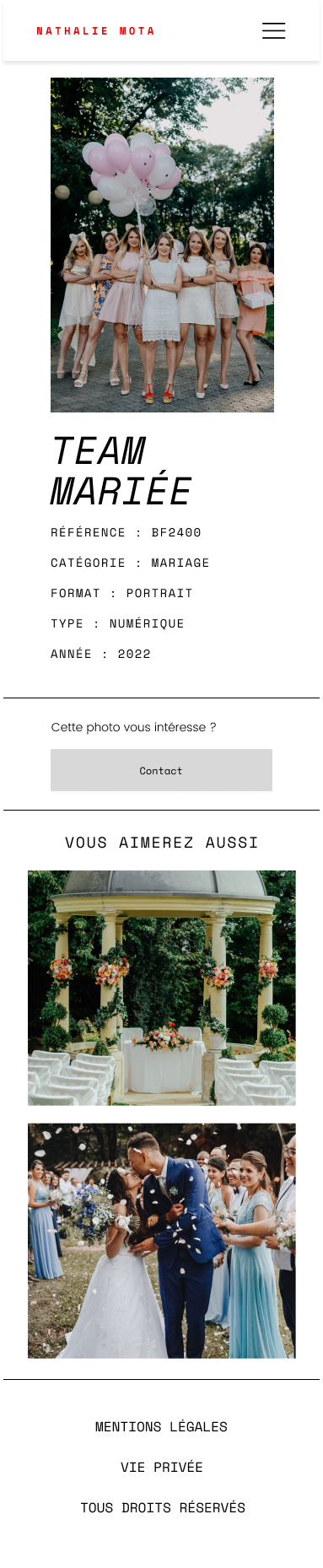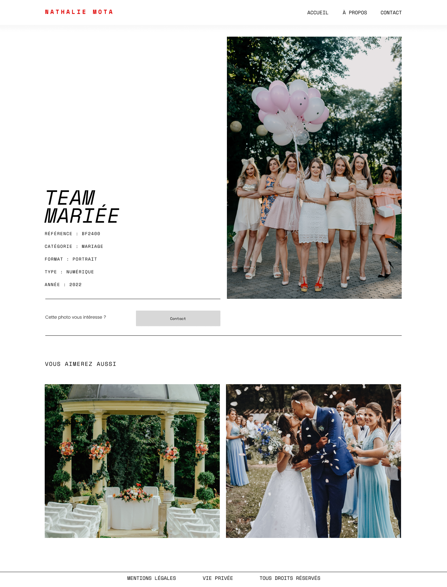 Site web pour Nathalie Mota, une photographe professionnelle spécialisée dans le domaine de l’événementiel. Ce site lui permet de se faire connaître et de partager ses collections de photos avec ses clients. Ces derniers ont la possibilité d’acheter les droits des photos, de les faire imprimer ou de commander des versions en haute définition.